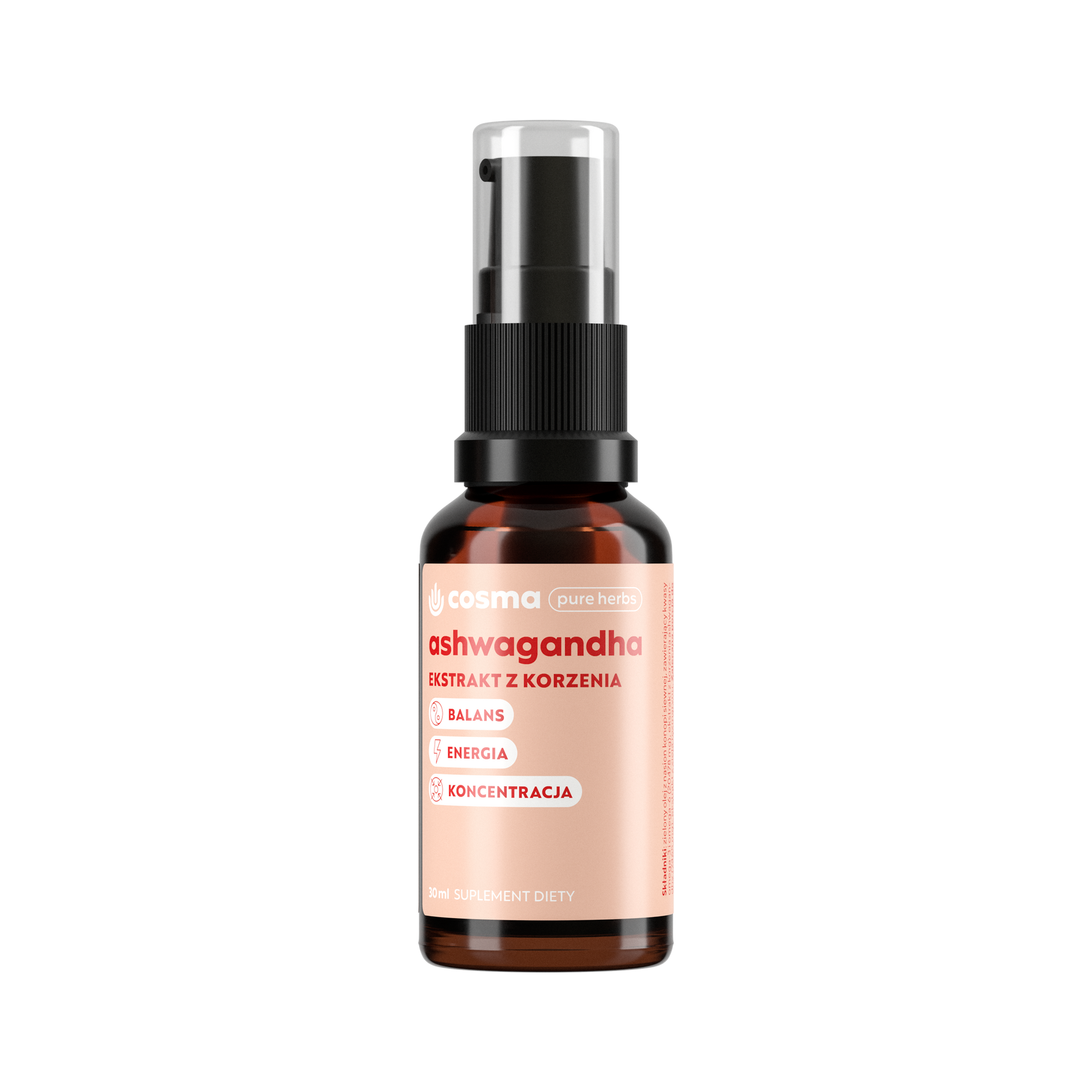 - Płynny ekstrakt z korzenia ashwagandhy w bazie oleju konopnego tłoczonego na zimno