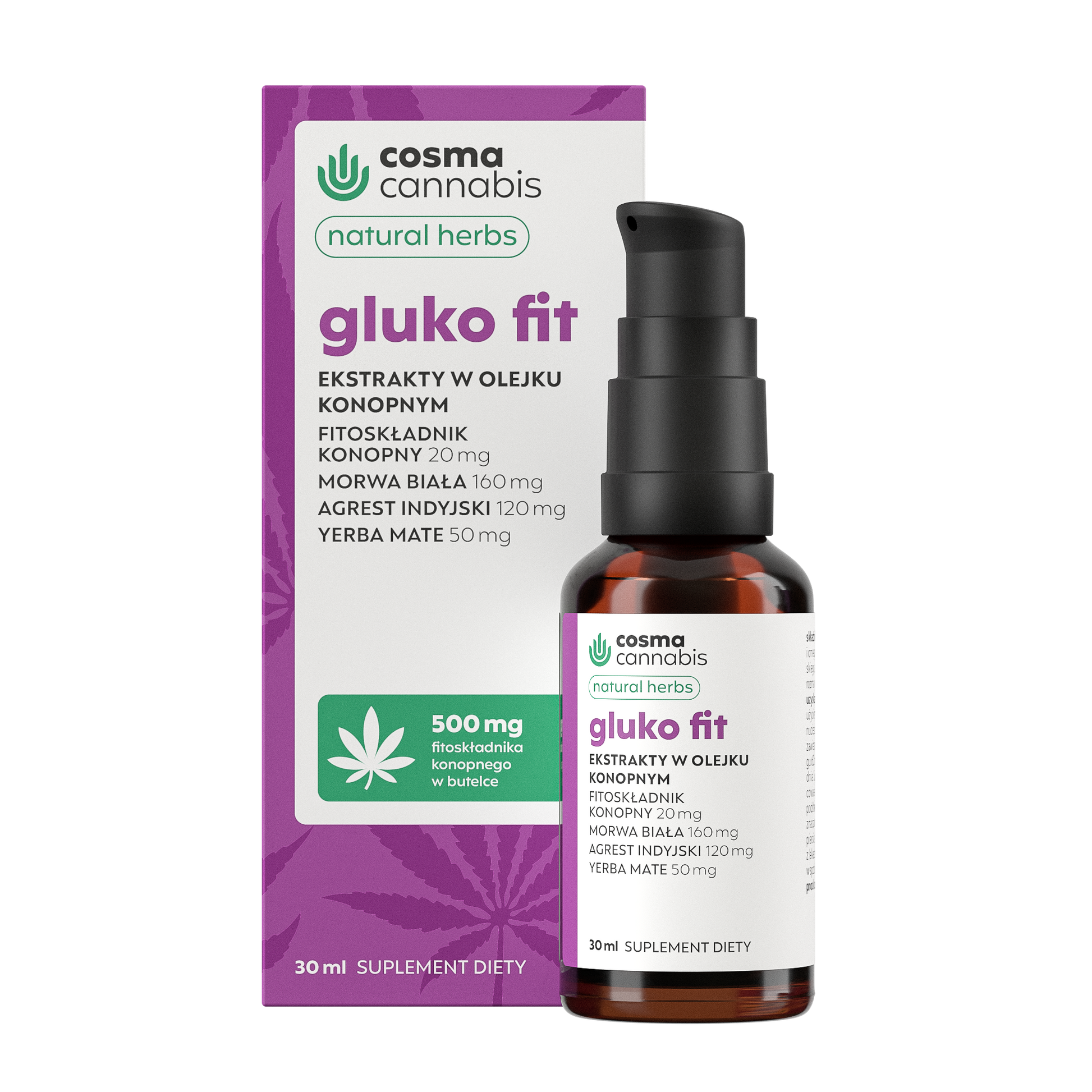 Olejek Cosma Gluko Fit: zielony olej z nasion konopi siewnej zawierający kwasy omega-3 i omega-6, ekstrakt z liści morwy białej, ekstrakt z owoców agrestu indyjskiego, ekstrakt z ziela yerba mate, fitoskładnik konopny , ekstrakt z ziela rozmarynu.